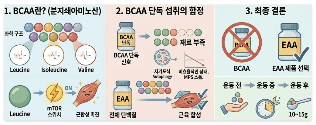 - BCAA 단독 장기 복용 시: 근육 회복 저하, 아미노산 불균형으로 인한 피로감.