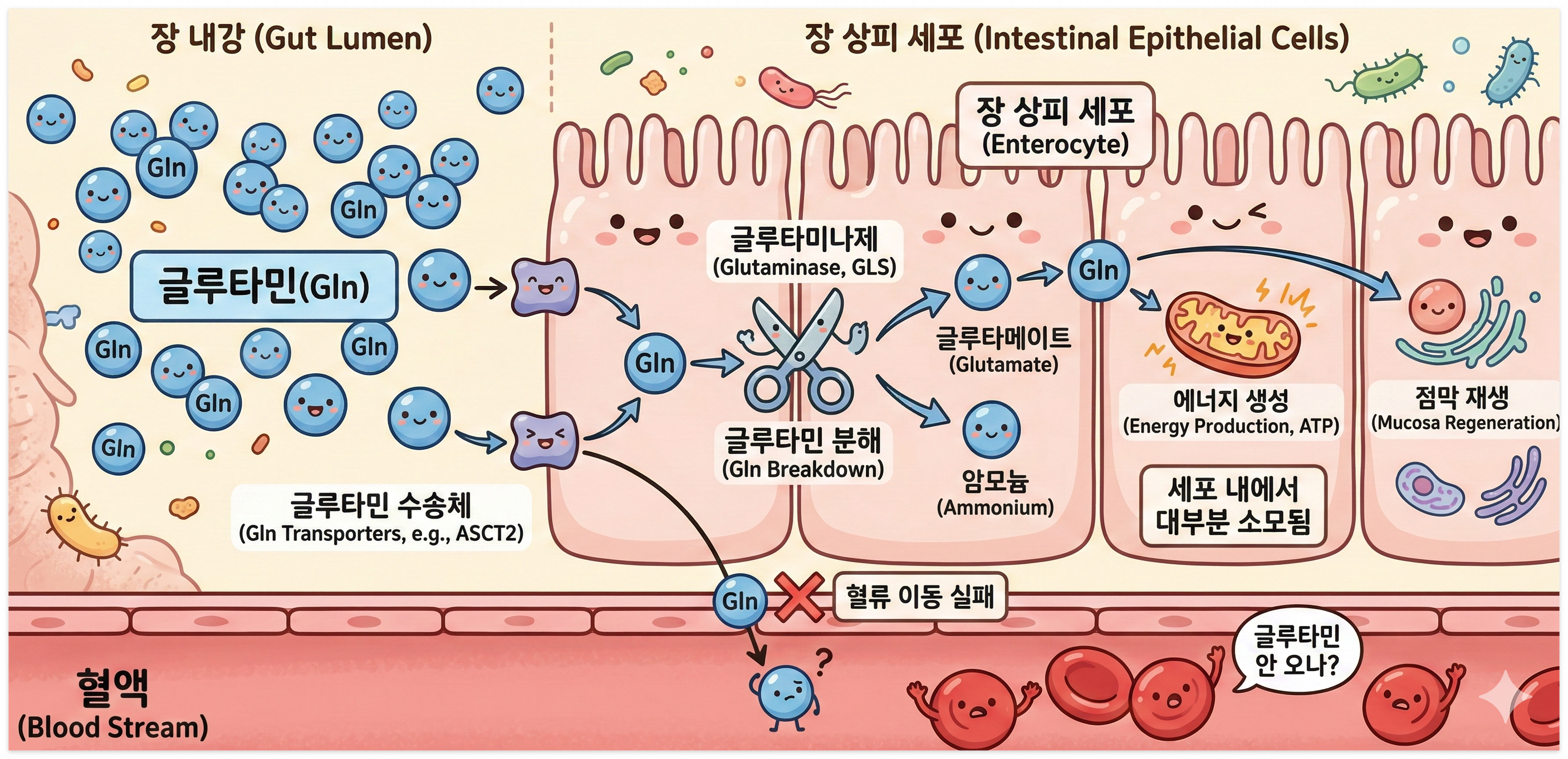 - 장내 격리 현상 (Gut Sequestration): 입으로 먹은 글루타민의 대부분은 장 세포가 '통행세'로 다 징수해 버립니다. 결과적으로 근육까지 도달하는 양은 매우 적습니다.