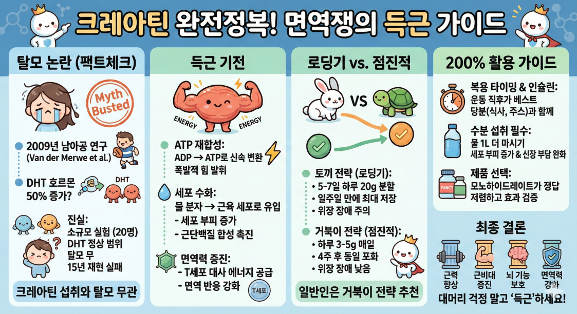"크레아틴 먹으면 머리 빠진다", "로딩 안 하면 효과 없다"는 말 때문에 시작을 망설이셨나요? 오늘 관련 논몬을 바탕으로 그 공포를 박살 내고, 가장 효율적인 복용법까지 낱낱이 공개합니다.