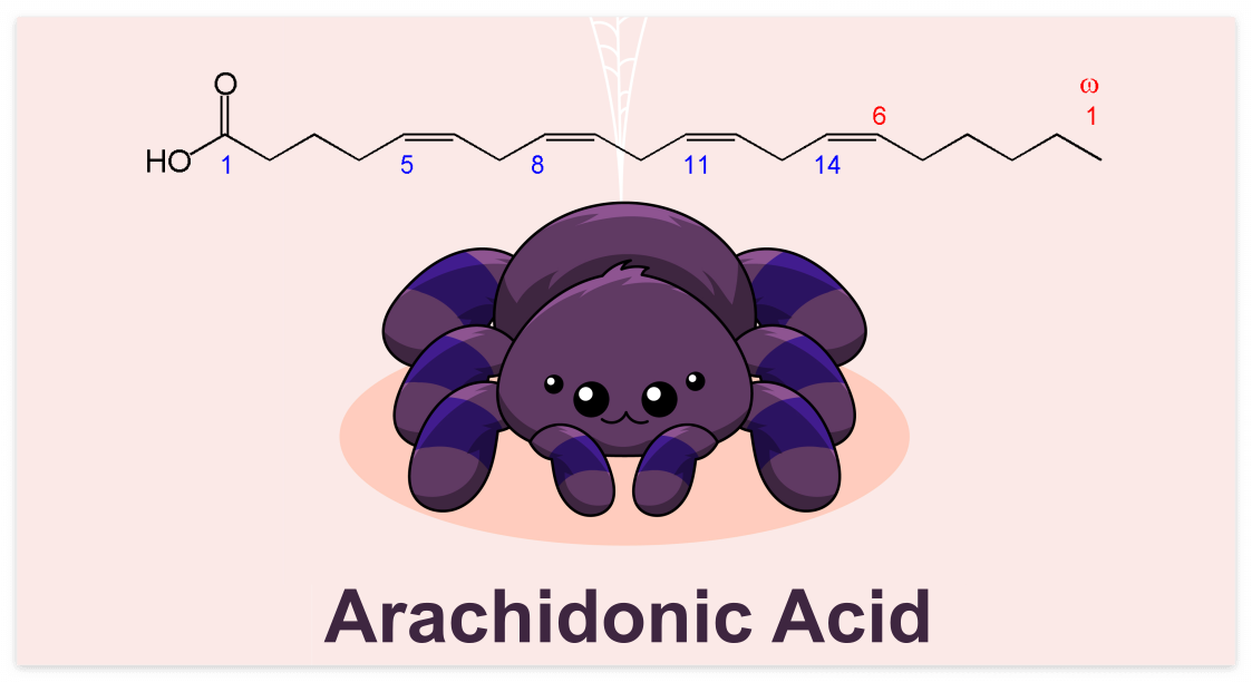 아라키돈산은 우리 몸의 세포막에 존재하는 오메가-6 불포화 지방산입니다. 주로 붉은 고기나 계란 노른자에 풍부하며, 우리 몸에서 염증 반응을 조절하는 핵심 물질로 쓰입니다.
