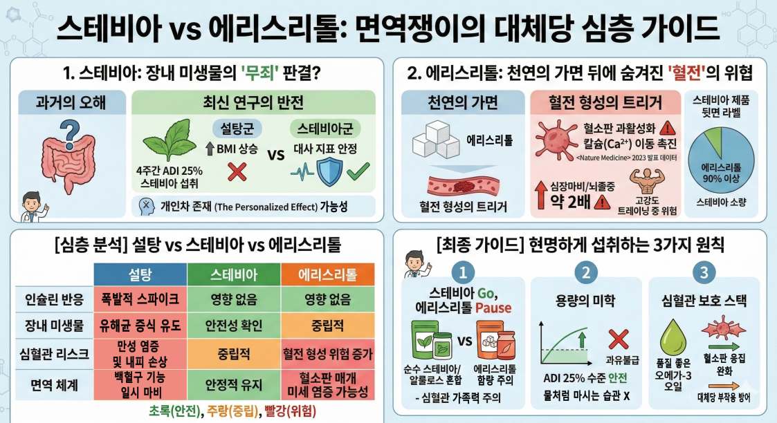 하지만 최근 과학계는 이 둘을 바라보는 시선이 극명하게 갈리고 있습니다. "스테비아는 생각보다 훨씬 깨끗하고, 에리스리톨은 생각보다 훨씬 위험할 수 있다"는 것이 핵심입니다. 오늘은 비교적 최신 임상 데이터까지 포함하여, 천연 대체당의 면역학적·심혈관적 진실을 아주 깊게 파헤쳐 보겠습니다.