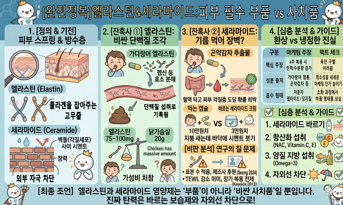 "엘라스틴과 세라마이드 영양제는 피부를 위한 '부품'이 아니라, 당신의 심리적 위안을 위한 '비싼 사치품'에 가깝습니다. 입으로 들어간 스프링과 시멘트가 얼굴까지 배달될 거라는 마케팅에 속지 마세요. 진짜 탄력을 원한다면 바르는 보습제와 자외선 차단이라는 기본으로 돌아가는 것이 가장 빠른 지름길입니다."