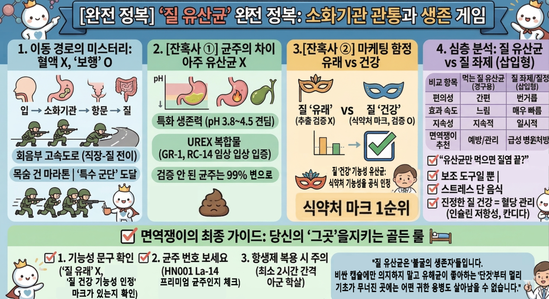 입에서 식도, 위, 소장, 대장을 거쳐 항문으로 나온 뒤, 다시 외부의 척박한 회음부를 지나 질 내부로 안착하기까지... 이 과정은 유산균에게 목숨을 건 마라톤과 같습니다. 이 경로를 버텨낼 수 있는 '특수 군단'만이 진짜 질 유산균이라는 이름을 달 수 있는 것이죠.