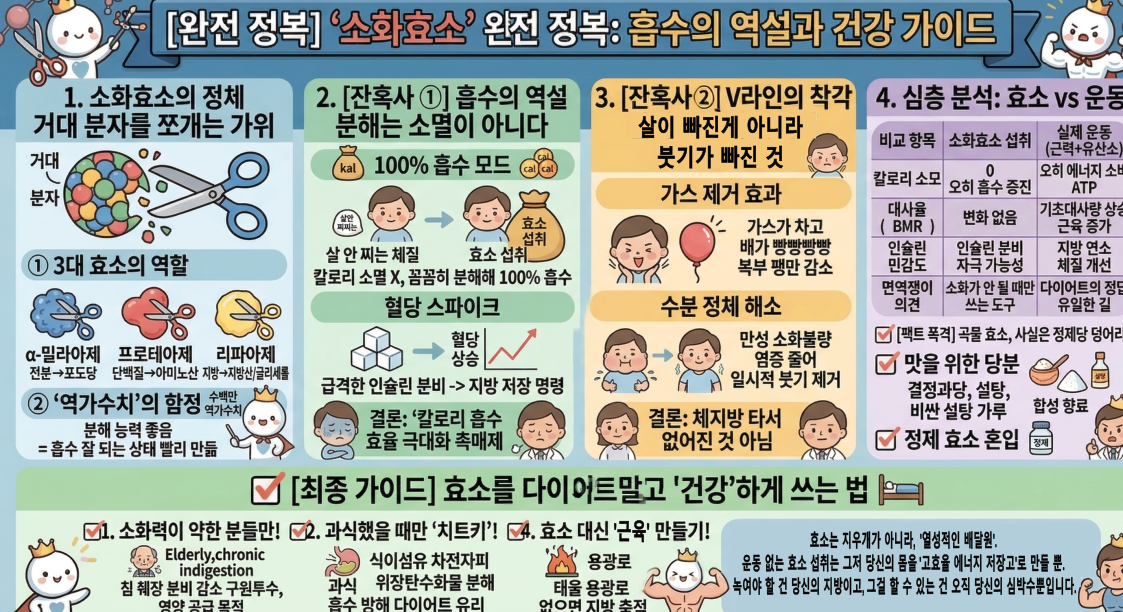 - 결론: 다이어트 관점에서 효소는 '칼로리 흡수 효율을 극대화하는 촉매제'입니다.