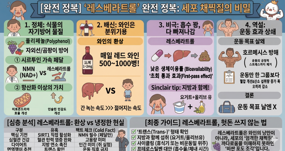 "레스베라트롤은 와인의 낭만이 아니라, 세포의 '엄격한 채찍질'입니다. 기름진 음식과 함께 먹고, 운동과는 거리를 두며, NMN이라는 연료를 채웠을 때만 비로소 작동하는 까다로운 부품이죠. 이 까다로움을 이해하지 못한 채 먹는 레스베라트롤은 그저 '비싼 포도 조각'에 불과합니다."